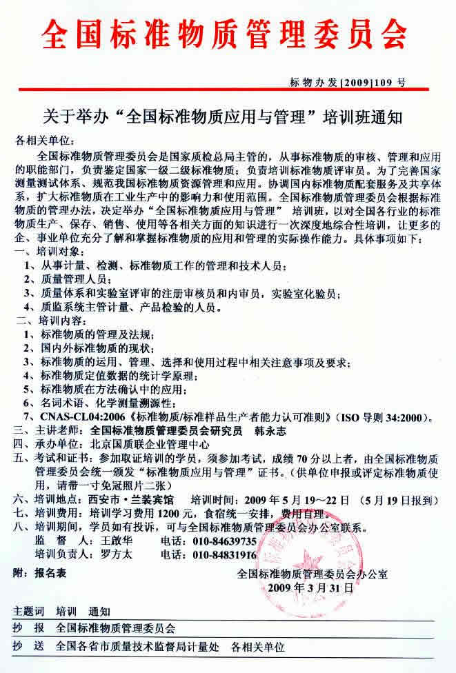 關于舉辦“全國標準物質應用與管理”培訓班的通知