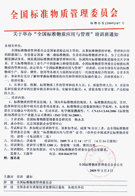 關于舉辦“全國標準物質應用與管理”培訓班的通知