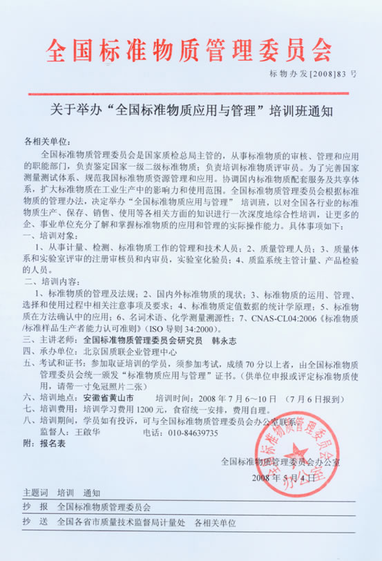 關于舉辦“全國標準物質應用與管理”培訓班的通知