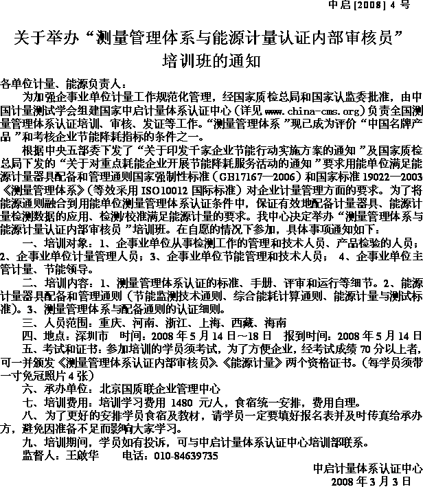 關于舉辦“測量管理體系與能源計量認證內部審核員”培訓班的通知
