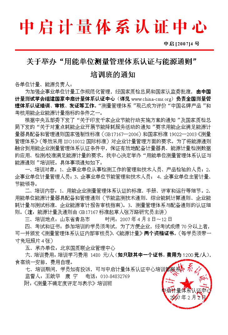 關于舉辦“用能單位測量管理體系認證與能源通則”培訓班的通知