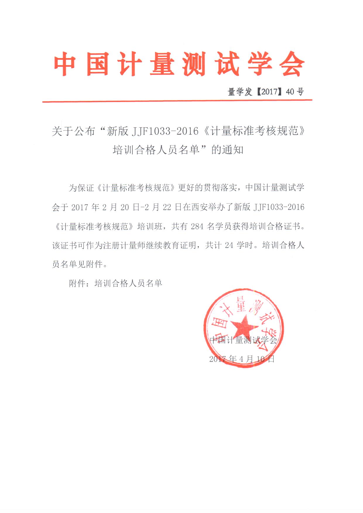 關于公布“新版JJF1033-2016《計量標準考核規范》培訓合格人員名單”的通知