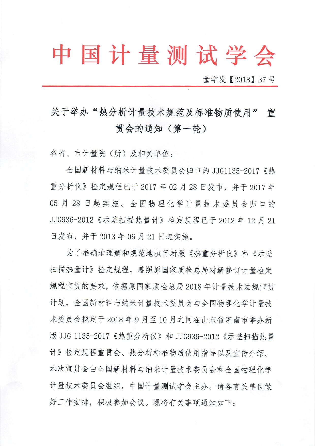 為了準(zhǔn)確地理解和規(guī)范地執(zhí)行新版《熱重分析儀》和《示差掃描熱量計(jì)》檢定規(guī)程,遵照原國(guó)家質(zhì)檢總局對(duì)新修訂計(jì)量檢定規(guī)程宣貫的要求,依據(jù)原國(guó)家質(zhì)檢總局2018年計(jì)量技術(shù)法規(guī)宣貫計(jì)劃,全國(guó)新材料與納米計(jì)量技術(shù)委員會(huì)與全國(guó)物理化學(xué)計(jì)量技術(shù)委員會(huì)擬定于2018年9月至10月之間在山東省濟(jì)南市舉辦新版JJG 1135-2017《熱重分析儀》和JJG936-2012《示差掃描熱量計(jì)》檢定規(guī)程宣貫會(huì)、熱分析標(biāo)準(zhǔn)物質(zhì)使用指導(dǎo)以及宣傳介紹。本次宣貫會(huì)由全國(guó)新材料與納米計(jì)量技術(shù)委員會(huì)和全國(guó)物理化學(xué)計(jì)量技術(shù)委員會(huì)組織,中國(guó)計(jì)量測(cè)試學(xué)會(huì)主辦。請(qǐng)各有關(guān)單位做好工作安排,積極參加會(huì)議。現(xiàn)將有關(guān)事項(xiàng)通知如下: